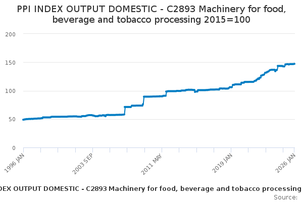 Download this time seriesPPI INDEX OUTPUT DOMESTIC - C2893 Machinery for food, beverage and tobacco processing 2015=100
