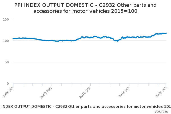 Download this time seriesPPI INDEX OUTPUT DOMESTIC - C2932 Other parts and accessories for motor vehicles 2015=100