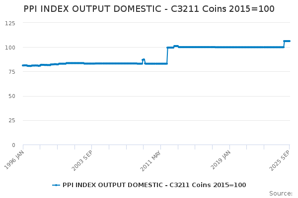 Download this time seriesPPI INDEX OUTPUT DOMESTIC - C3211 Coins 2015=100