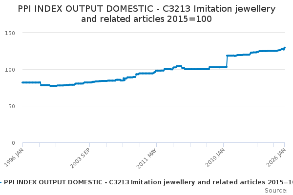 Download this time seriesPPI INDEX OUTPUT DOMESTIC - C3213 Imitation jewellery and related articles 2015=100
