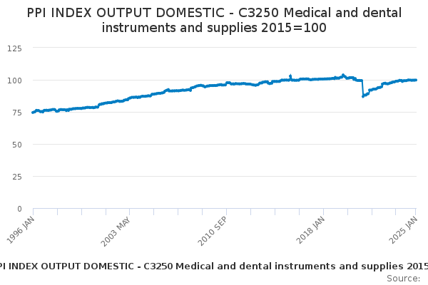 Download this time seriesPPI INDEX OUTPUT DOMESTIC - C3250 Medical and dental instruments and supplies 2015=100