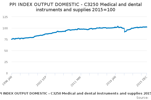 Download this time seriesPPI INDEX OUTPUT DOMESTIC - C3250 Medical and dental instruments and supplies 2015=100