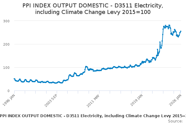 Download this time seriesPPI INDEX OUTPUT DOMESTIC - D3511 Electricity, including Climate Change Levy 2015=100