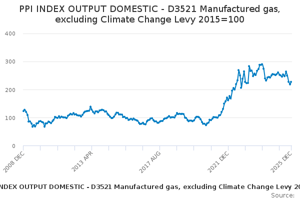 Download this time seriesPPI INDEX OUTPUT DOMESTIC - D3521 Manufactured gas, excluding Climate Change Levy 2015=100