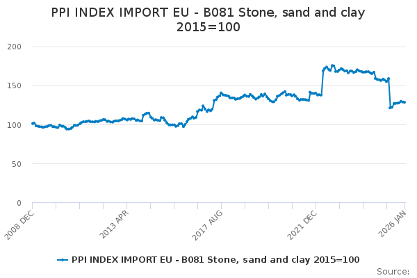 Download this time seriesPPI INDEX IMPORT EU - B081 Stone, sand and clay 2015=100