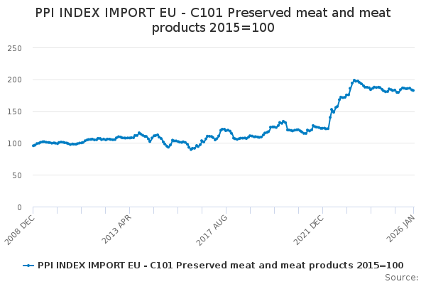 Download this time seriesPPI INDEX IMPORT EU - C101 Preserved meat and meat products 2015=100