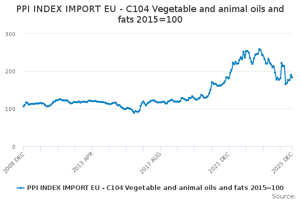 Download this time seriesPPI INDEX IMPORT EU - C104 Vegetable and animal oils and fats 2015=100