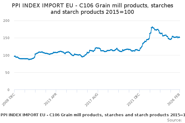 Download this time seriesPPI INDEX IMPORT EU - C106 Grain mill products, starches and starch products 2015=100