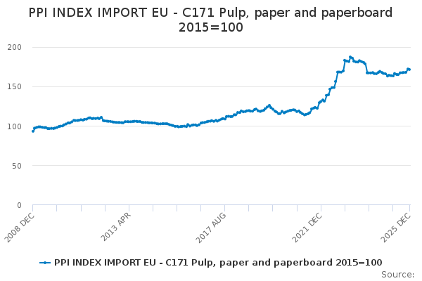 Download this time seriesPPI INDEX IMPORT EU - C171 Pulp, paper and paperboard 2015=100