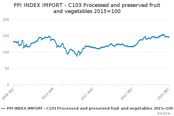 Download this time seriesPPI INDEX IMPORT - C103 Processed and preserved fruit and vegetables 2015=100