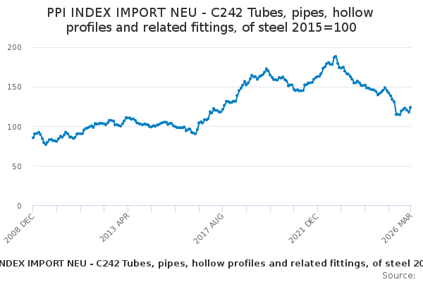 Download this time seriesPPI INDEX IMPORT NEU - C242 Tubes, pipes, hollow profiles and related fittings, of steel 2015=100