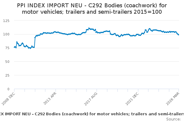 Download this time seriesPPI INDEX IMPORT NEU - C292 Bodies (coachwork) for motor vehicles; trailers and semi-trailers 2015=100
