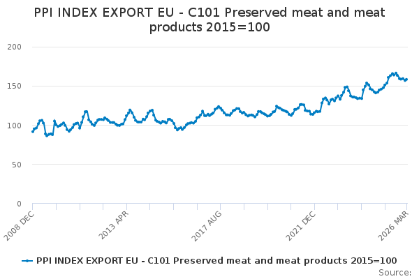 Download this time seriesPPI INDEX EXPORT EU - C101 Preserved meat and meat products 2015=100