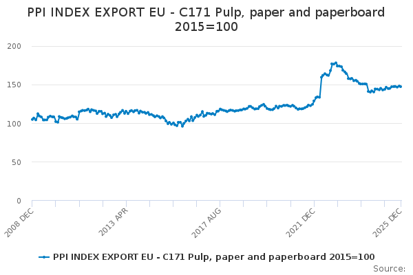 Download this time seriesPPI INDEX EXPORT EU - C171 Pulp, paper and paperboard 2015=100