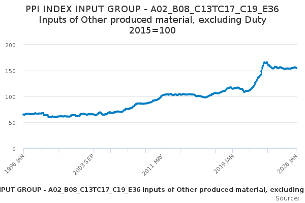 Download this time seriesPPI INDEX INPUT GROUP - A02_B08_C13TC17_C19_E36 Inputs of Other produced material, excluding Duty 2015=100