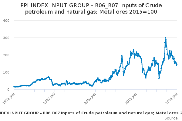 Download this time seriesPPI INDEX INPUT GROUP - B06_B07 Inputs of Crude petroleum and natural gas; Metal ores 2015=100