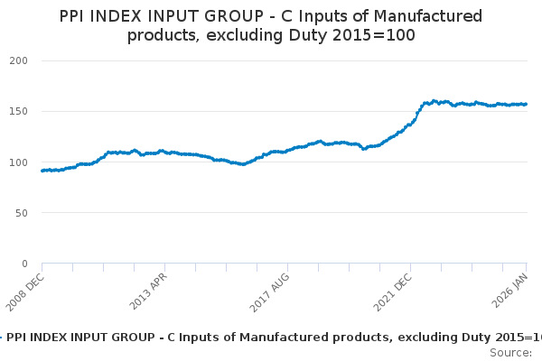 Download this time seriesPPI INDEX INPUT GROUP - C Inputs of Manufactured products, excluding Duty 2015=100