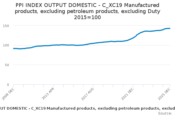 Download this time seriesPPI INDEX OUTPUT DOMESTIC - C_XC19 Manufactured products, excluding petroleum products, excluding Duty 2015=100