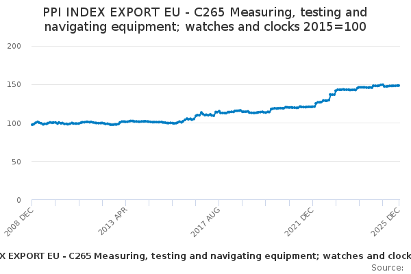 Download this time seriesPPI INDEX EXPORT EU - C265 Measuring, testing and navigating equipment; watches and clocks 2015=100