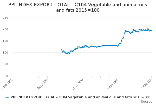 Download this time seriesPPI INDEX EXPORT TOTAL - C104 Vegetable and animal oils and fats 2015=100
