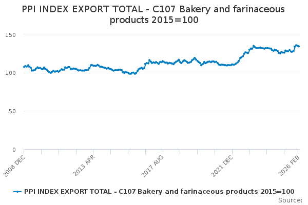 Download this time seriesPPI INDEX EXPORT TOTAL - C107 Bakery and farinaceous products 2015=100