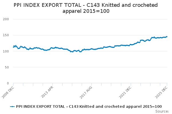 Download this time seriesPPI INDEX EXPORT TOTAL - C143 Knitted and crocheted apparel 2015=100