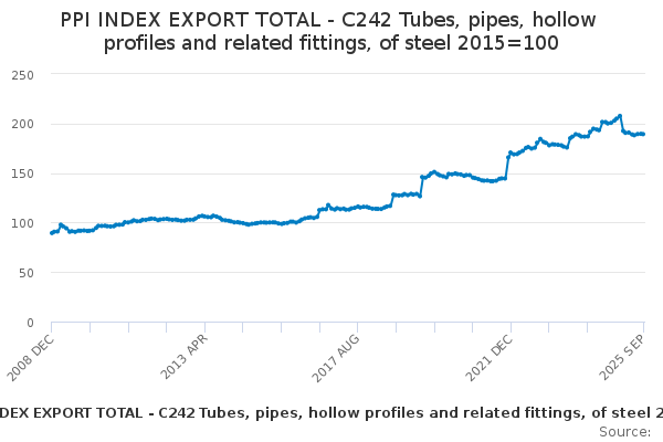 Download this time seriesPPI INDEX EXPORT TOTAL - C242 Tubes, pipes, hollow profiles and related fittings, of steel 2015=100
