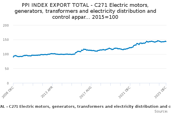 Download this time seriesPPI INDEX EXPORT TOTAL - C271 Electric motors, generators, transformers and electricity distribution and control appar... 2015=100