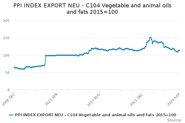 Download this time seriesPPI INDEX EXPORT NEU - C104 Vegetable and animal oils and fats 2015=100