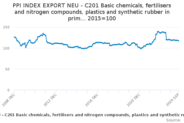 Download this time seriesPPI INDEX EXPORT NEU - C201 Basic chemicals, fertilisers and nitrogen compounds, plastics and synthetic rubber in prim... 2015=100