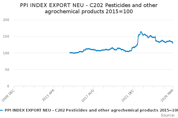 Download this time seriesPPI INDEX EXPORT NEU - C202 Pesticides and other agrochemical products 2015=100