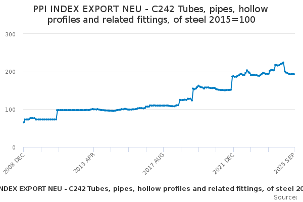Download this time seriesPPI INDEX EXPORT NEU - C242 Tubes, pipes, hollow profiles and related fittings, of steel 2015=100