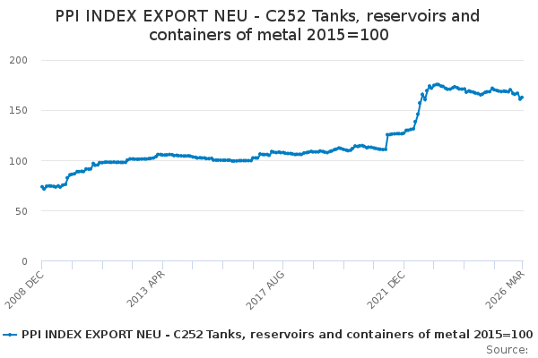Download this time seriesPPI INDEX EXPORT NEU - C252 Tanks, reservoirs and containers of metal 2015=100