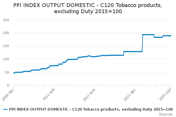 Download this time seriesPPI INDEX OUTPUT DOMESTIC - C120 Tobacco products, excluding Duty 2015=100