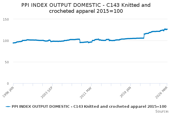 Download this time seriesPPI INDEX OUTPUT DOMESTIC - C143 Knitted and crocheted apparel 2015=100