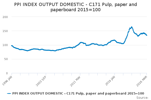 Download this time seriesPPI INDEX OUTPUT DOMESTIC - C171 Pulp, paper and paperboard 2015=100
