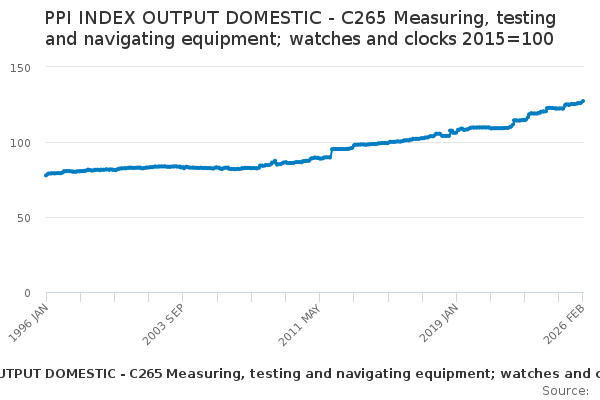 Download this time seriesPPI INDEX OUTPUT DOMESTIC - C265 Measuring, testing and navigating equipment; watches and clocks 2015=100