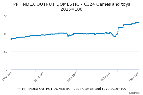 Download this time seriesPPI INDEX OUTPUT DOMESTIC - C324 Games and toys 2015=100