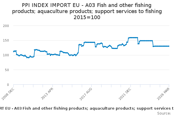 Download this time seriesPPI INDEX IMPORT EU - A03 Fish and other fishing products; aquaculture products; support services to fishing 2015=100