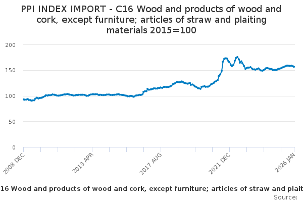 Download this time seriesPPI INDEX IMPORT - C16 Wood and products of wood and cork, except furniture; articles of straw and plaiting materials 2015=100