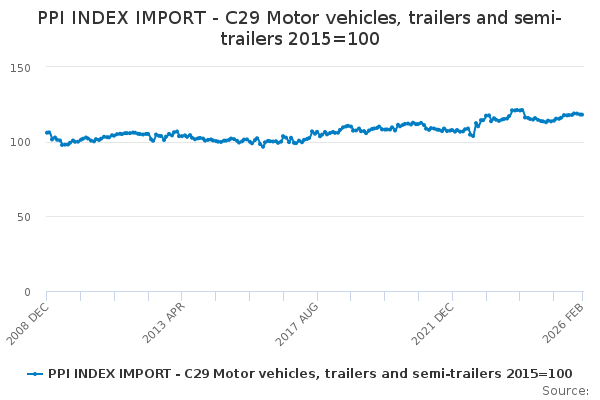 Download this time seriesPPI INDEX IMPORT - C29 Motor vehicles, trailers and semi-trailers 2015=100