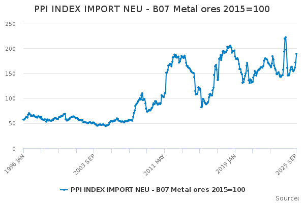 Download this time seriesPPI INDEX IMPORT NEU - B07 Metal ores 2015=100