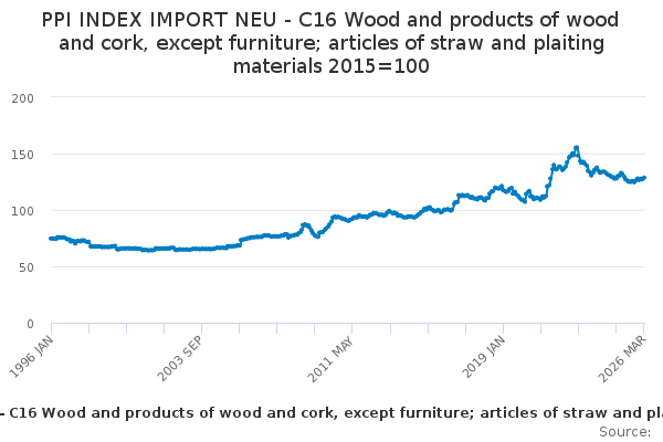 Download this time seriesPPI INDEX IMPORT NEU - C16 Wood and products of wood and cork, except furniture; articles of straw and plaiting materials 2015=100