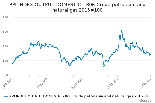 Download this time seriesPPI INDEX OUTPUT DOMESTIC - B06 Crude petroleum and natural gas 2015=100