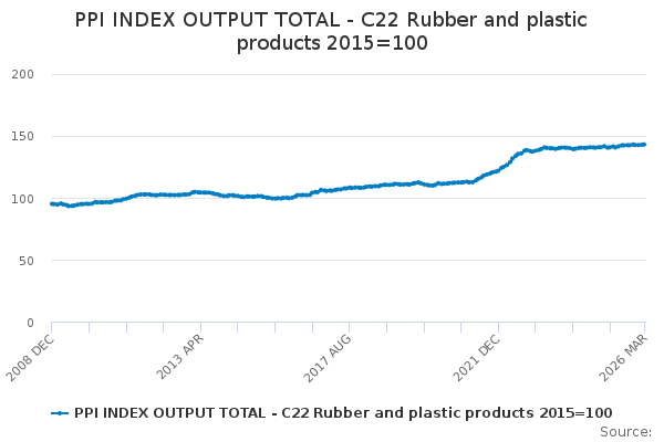 Download this time seriesPPI INDEX OUTPUT TOTAL - C22 Rubber and plastic products 2015=100