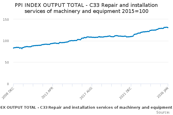 Download this time seriesPPI INDEX OUTPUT TOTAL - C33 Repair and installation services of machinery and equipment 2015=100