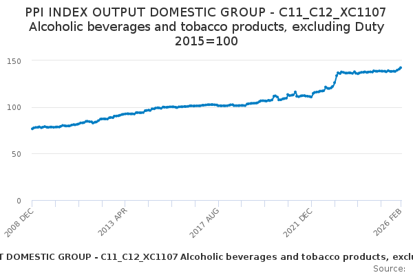 Download this time seriesPPI INDEX OUTPUT DOMESTIC GROUP - C11_C12_XC1107 Alcoholic beverages and tobacco products, excluding Duty 2015=100