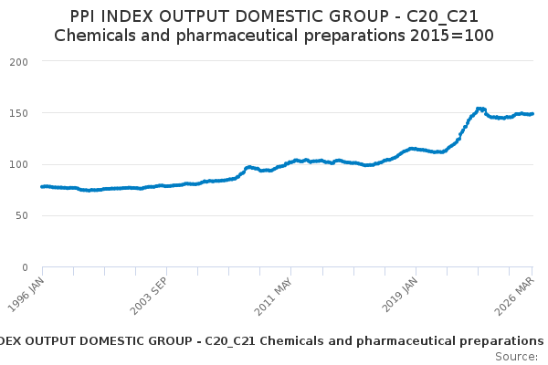 Download this time seriesPPI INDEX OUTPUT DOMESTIC GROUP - C20_C21 Chemicals and pharmaceutical preparations 2015=100