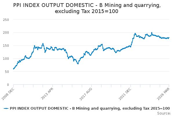 Download this time seriesPPI INDEX OUTPUT DOMESTIC - B Mining and quarrying, excluding Tax 2015=100