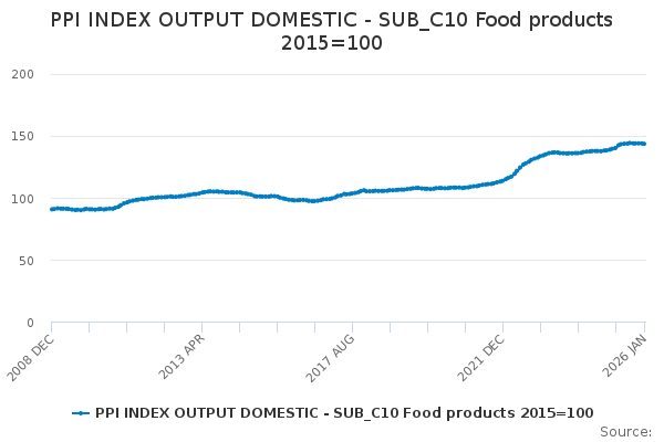 Download this time seriesPPI INDEX OUTPUT DOMESTIC - SUB_C10 Food products 2015=100